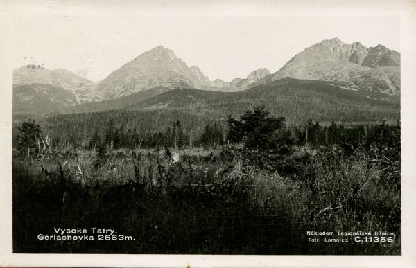 Widok na Tępą, Kończystą, Batyżowiecki Szczyt i Gerlach z Tatrzańskiej Polanki. Na pierwszym planie polana, w głębi las. Na dole po lewej stronie wpisany tytuł, po prawej nakładca.