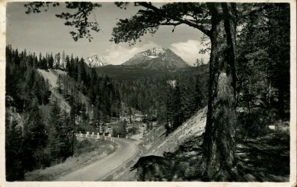 Widok na Kończystą i Gerlach z Tatrzańskiej Polanki. Na pierwszym planie limba (Pinus cembra L.), w głębi las. W lewym dolnym rogu Droga Wolności.