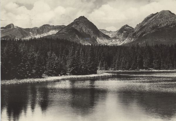 Widok znad Szczyrbskiego Jeziora na panoramę Tatr. Widoczne od lewej Krywań, Ostra, Wielkie Solisko, Szczyrbski Szczyt, Skrajna Baszta.