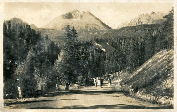 Widok na Gerlach z Tatrzańskiej Polanki. W tle po lewej stronie Kończysta. Na pierwszym planie Droga Wolności, po której idą turyści. W głębi las.