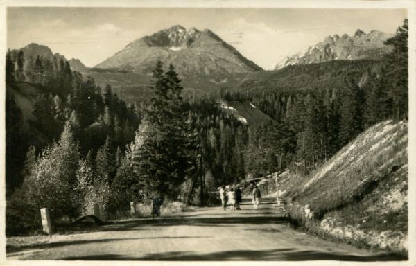 Widok na Gerlach z Tatrzańskiej Polanki. W tle po lewej stronie Kończysta. Na pierwszym planie Droga Wolności, po której idą turyści. W głębi las.