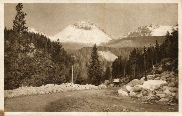 Widok na Gerlach z Tatrzańskiej Polanki. Na pierwszym planie Droga Wolności, po której jedzie zaprzęg konny. W głębi las.