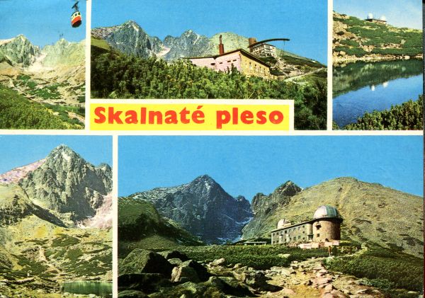 Budynek Obserwatorium Astronomicznego SAN z Łomnicą, Widłami, Kieżmarskim Szczytem i Huncowskim Szczytem w tle. W środku napis: Skalnaté pleso.
