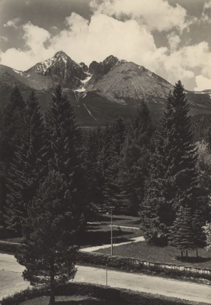 Widok z Tatrzańskiej Łomnicy na Łomnicê i Kiezmarski Szczyt. Na pierwszym planie park miejski.