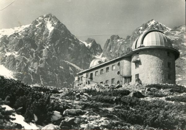 Tatrzański Park Narodowy [Słowacja]. Obserwatorium Astronomiczne SAN nad Łomnickim Stawem. W tle Łomnica, Widły z przełêcz± w Widłach i Kieżmarski Szczyt.