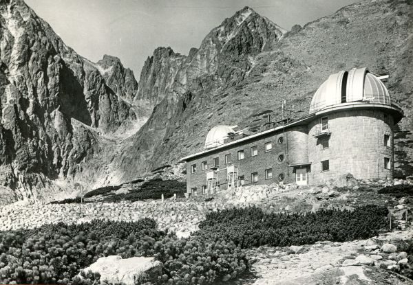 Widok na Obserwatorium Astronomiczne SAN w Dolinie Łomnickiej. W tle Łomnica, Widły i Kieżmarski Szczyt. Na pierwszym planie kosodrzewina (Pinus mugo Turra).