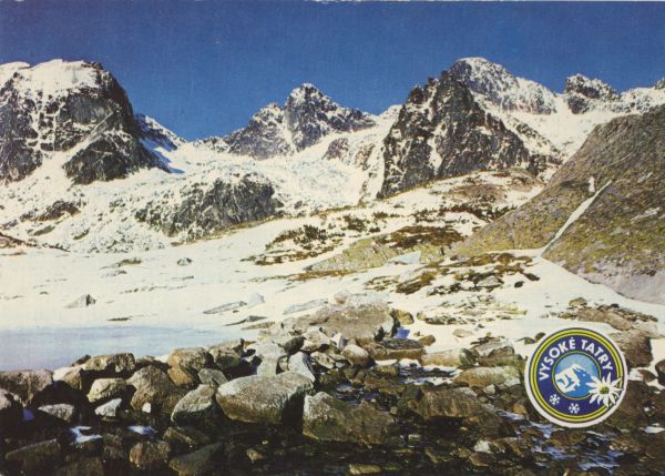 Wiosenny widok znad Warzęchowego Stawu na czę¶ć Jaworowego Szczytu, Ostry Szczyt, Mały Lodowy Szczyt, Czerwon± Ławkę i Sp±gę. Na dole po prawej stronie logo miasta VYSOKÉ TATRY.