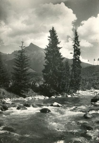 Widok na Krywań z Podbańskiej. Na pierwszym planie potok Biała Liptowska. Na jego brzegu rosną pojedyncze drzewa.