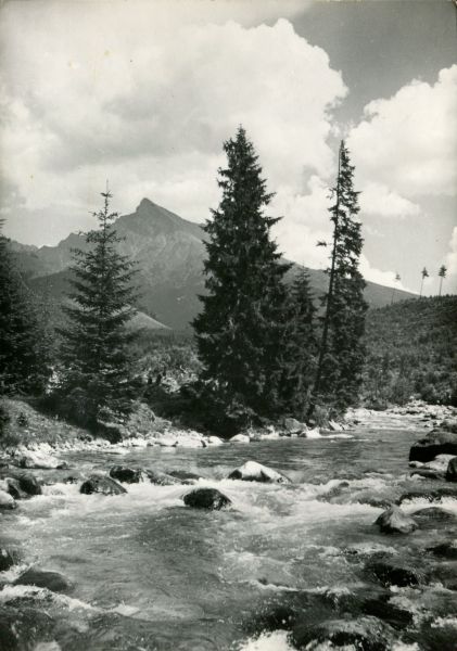 Widok na Krywań z Podbańskiej. Na pierwszym planie potok Biała Liptowska. Na jego brzegu rosną pojedyncze drzewa.