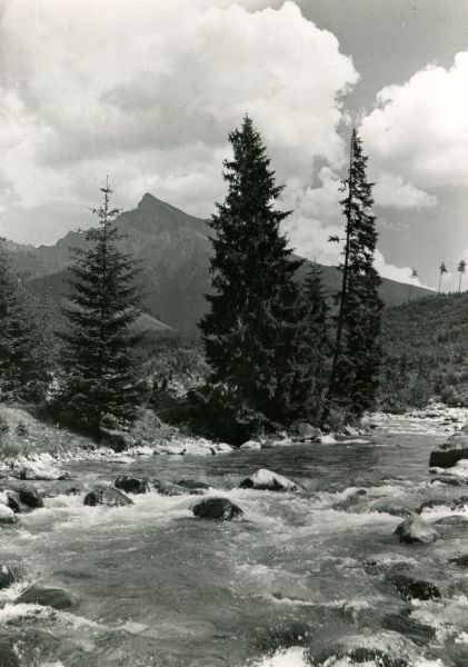Widok na Krywań z Podbańskiej. Na pierwszym planie potok Biała Liptowska. Na jego brzegu rosną pojedyncze drzewa.