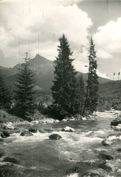Widok na Krywań z Podbańskiej. Na pierwszym planie potok Biała Liptowska. Na jego brzegu rosną pojedyncze drzewa.