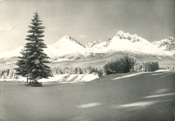 Widok na Kończyst±, Batyżowiecki Szczyt i Gerlach w scenerii zimowej. Na pierwszym planie drzewo. W głêbi las.