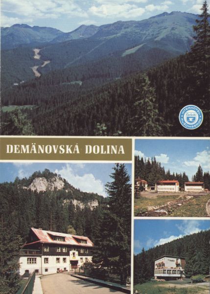 Hotel Družba. W środkowej części po prawej stronie logo INTERHOTEL RUŽOMBEROK, po lewej stronie napis DEMÄNOVSKÁ DOLINA.