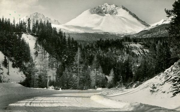 Widok na Gerlach w zimowej scenerii z Tatrzańskiej Polanki. Na pierwszym planie Droga Wolności, w głębi las.