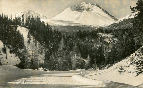 Widok na Gerlach w zimowej scenerii z Tatrzańskiej Polanki. Na pierwszym planie Droga Wolności, w głębi las.