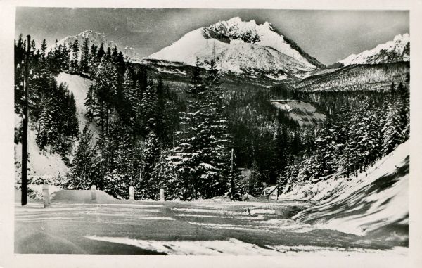 Widok na Gerlach w zimowej scenerii z Tatrzańskiej Polanki. Na pierwszym planie Droga Wolności, w głębi las.