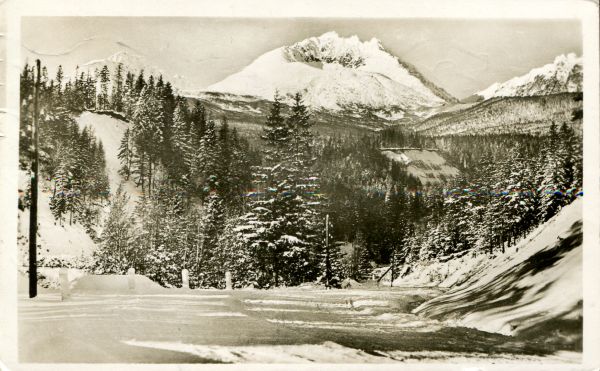 Widok na Gerlach w zimowej scenerii z Tatrzańskiej Polanki. Na pierwszym planie Droga Wolności, w głębi las.