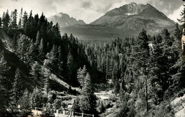 Widok na Kończystą i Gerlach z Tatrzańskiej Polanki. Na pierwszym planie las. W lewym dolnym rogu Droga Wolności.