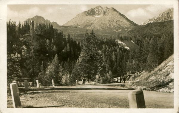 Widok na Gerlach z Tatrzańskiej Polanki. W tle po lewej stronie Kończysta. Na pierwszym planie Droga Wolności, po której idą 3 osoby. W głębi las.