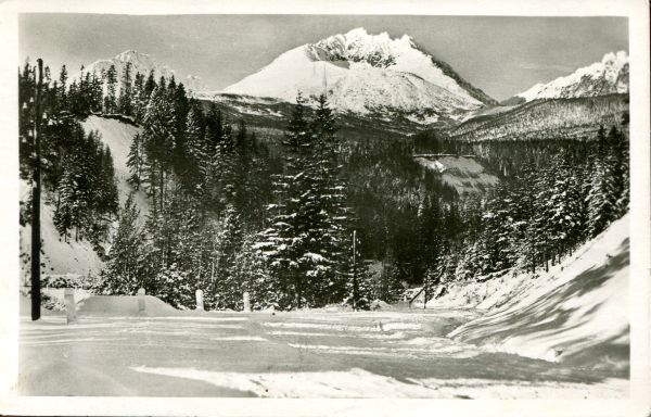 Widok na Gerlach w zimowej scenerii z Tatrzańskiej Polanki. Na pierwszym planie Droga Wolności, w głębi las.