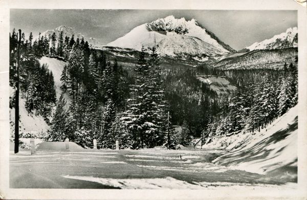 Widok na Gerlach w zimowej scenerii z Tatrzańskiej Polanki. Na pierwszym planie Droga Wolności, w głębi las.