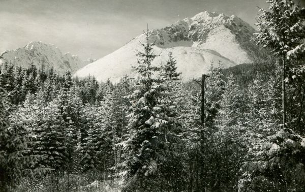 Widok na Gerlach i Kończystą w zimowej scenerii. Na pierwszym planie las.