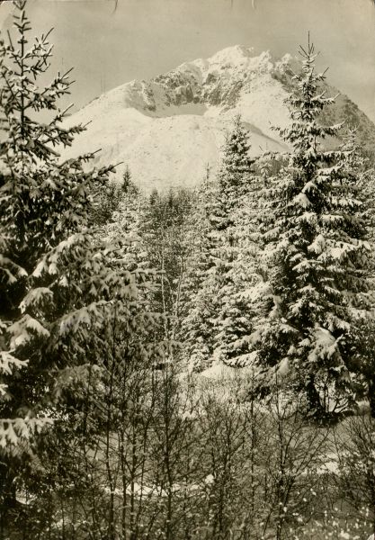 Widok na Gerlach w zimowej scenerii. Na pierwszym planie las.