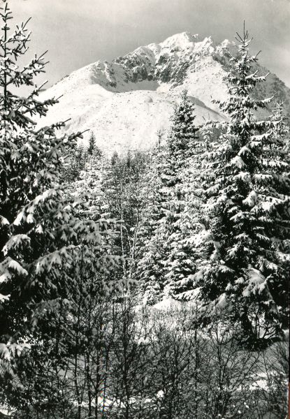 Widok na Gerlach w zimowej scenerii. Na pierwszym planie las.