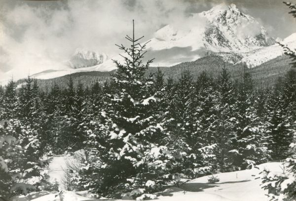 Widok na Kończystą i Gerlach w zimowej scenerii. Na pierwszym planie las.