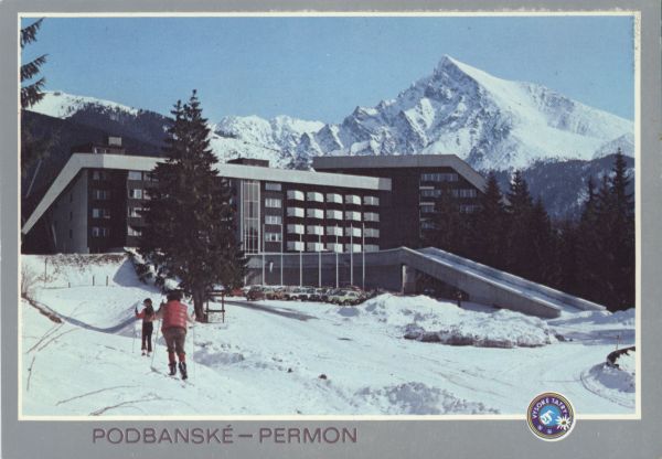 Budynek Centrum Rekreacyjno-Rehabilitacyjnego OKD Permon w Podbańskiej i jego otoczenie w scenerii zimowej. Przed budynkiem zaparkowany autobus. W tle Krywań. Z lewej strony pod zdjęciem napis: PODBANSKÉ - PERMON. W prawym rogu u dołu logo miasta VYSOKÉ TATRY.