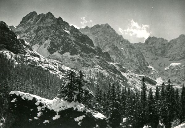 Tatry Wysokie. Widok z Doliny Białej Wody na południe: w przodzie Hruba Turnia, W tle Zadni Gerlach, Batyżowiecki Szczyt i Kaczy Szczyt.