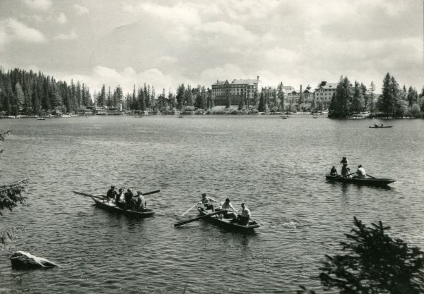 Widok na Szczyrbskie Jezioro, po którym pływają łodzie. W dali na brzegu jeziora las i budynki sanatoryjne Hwiezdoslaw i Krywań.