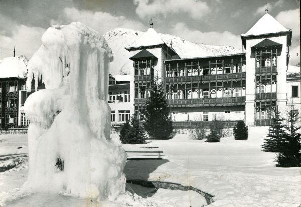 Widok na budynek sanatorium w Nowym Smokowcu i jego otoczenie w scenerii zimowej. Na pierwszym planie zamarznięta fontanna. W tle Sławkowski Szczyt.