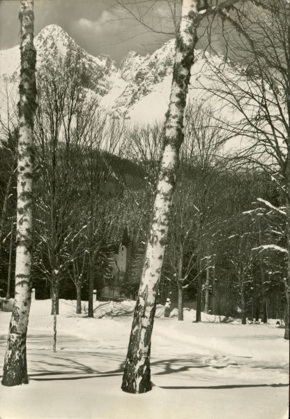 Zimowy widok z parku w Tatrzańskiej Łomnicy na Łomnicę, Widły i Kieżmarski Szczyt. W głębi Kościół ewangelicki otoczony lasem. Na pierwszym planie brzozy (Betula L.).