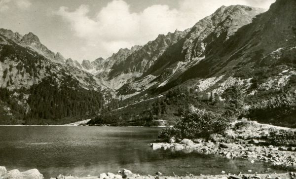 Widok na Popradzki Staw i Dolinę Złomisk. Na pierwszym planie głazy, po prawej stronie kosodrzewina (Pinus mugo Turra). W tle szczyty otaczające Dolinę Złomisk: Złomiska Turnia, Wschodnie Żelazne Wrota, Wschodni Szczyt Żelaznych Wrót, Zmarzły Szczyt, północna Grań Kończystej, Tępa i Osterwa.