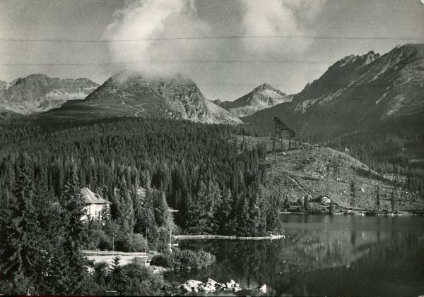 Widok na Szczyrbskie Jezioro i jego otoczenie. W tle szczyty, od lewej: Ostra, Wielkie Solisko, Szczyrbski Szczyt i grañ Baszt ze Skrajn± Baszt±. Pod Szczyrbskim Szczytem widoczna skocznia narciarska.