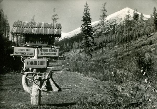 VYSOKÉ TATRY Informačný stľp Tatranského nár. parku. V pozadí Lúčne sedlo.