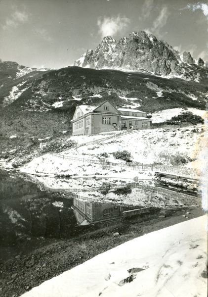 Widok na schronisko im. Alberta Brnčala przy Zielonym Stawie Kieżmarskim. W tle widać Kozią Turnię nad Doliną Jagnięcą.