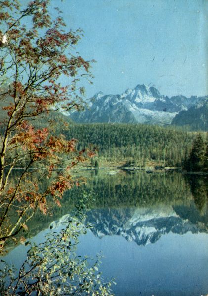 Tatry Wysokie - Szczyrbskie Jezioro, w tle Wysoka. Tytuł również w języku: ros., niem., ang.