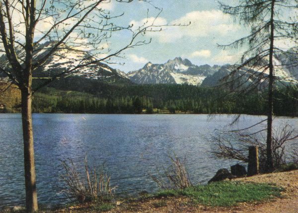Widok na Szczyrbskie Jezioro i jego otoczenie. Na pierwszym planie pojedyncze drzewa, w głębi las. W tle od lewej: Skrajna Baszta, Kopa Popradzka, Wysoka, za drzewem widać Osterwę, Tęp± i Kończyst±.