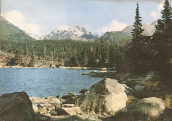 Widok na Szczyrbskie Jezioro i jego otoczenie. Na pierwszym planie głazy, w głębi las. W tle od lewej: Skrajna Baszta, Kopa Popradzka, Wysoka, Osterwa, Tępa i Kończysta.