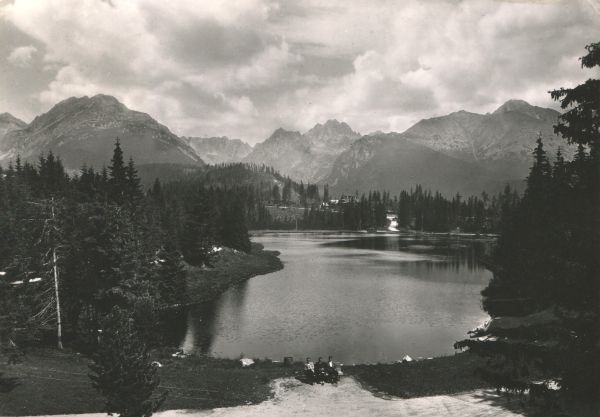 Widok na Nowe Szczyrbskie Jezioro otoczone lasem. Na pierwszym planie trzech mężczyzn siedzi na ławeczce nad jeziorem. W tle od lewej: grań Baszt ze Skrajną Basztą, Wołowy Grzbiet, Kopa Popradzka, Wysoka, Tępa i Kończysta. Z przodu Osterwa.
