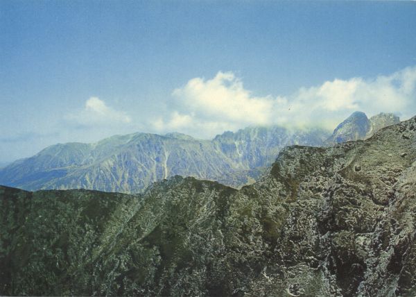 TATRY WYSOKIE. Grań Uhrocia, w głębi od lewej: Koszysta (2193 m), Żółta Turnia (2087 m), Granaty (2239 m), w chmurach Kościelec (2158 m).