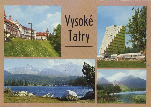 Pocztówka 4. elementowa. Dwa zdjęcia z miejscowo¶ci Szczyrbskie Jezioro: sanatoria Krywań i Hviezdoslav oraz hotel Panorama i dwa pejzaże znad Szczyrbskiego Jeziora. U góry pomiędzy fotografiami napis VYSOKÉ TATRY.