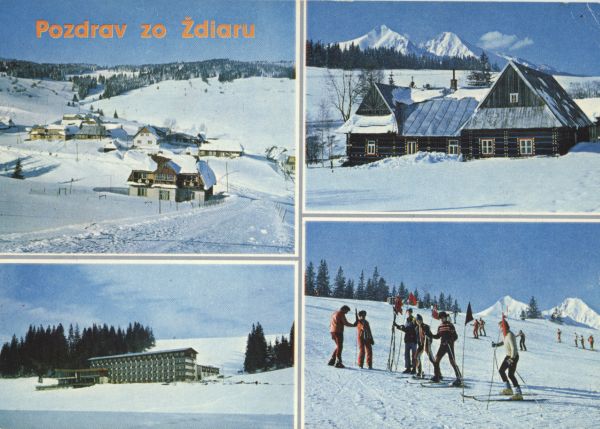 Tereny narciarskie w okolicy Zdziaru, w tle Płaczliwa Skała i Hawrań. U góry po lewej stronie napis: Pozdrav zo źdiaru.