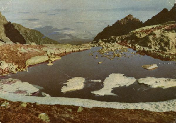 Tatry Wysokie. Dolina Małej Zimnej Wody. Widok od Małego Stawu Spiskiego na Kotlinę Spiską. Tytuł również w języku: ros., ang., niem.