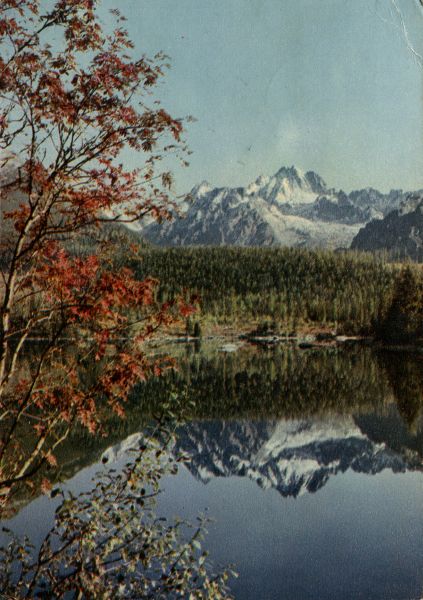 Tatrzański Park Narodowy [Słowacja]. Szczyrbskie Jezioro, w tle Wysoka. Tytuł również w języku: ros., ang., niem.