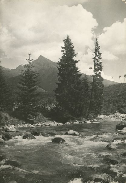 Widok na Krywań z Podbańskiej. Na pierwszym planie potok Biała Liptowska. Na jego brzegu rosną pojedyncze drzewa.