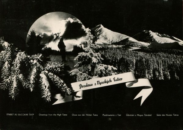Kartka okolicznościowa. Po lewej stronie gałązka. W głębi narciarz na tle księżyca. Po prawej stronie Krywań i Ostra. Na dole wpisany tytuł pocztówki.