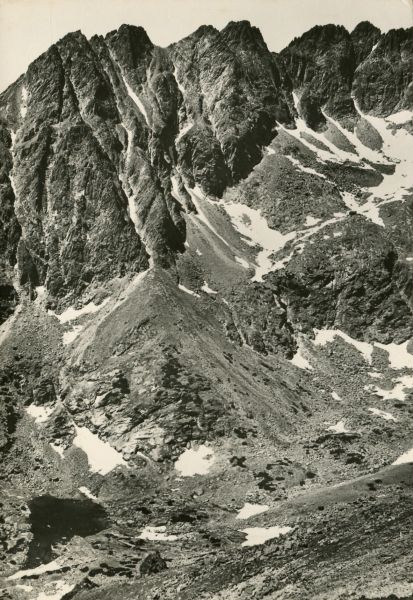 VYSOKÉ TATRY - pohľad z Patrie (2205 m) na pleso pod Skokom (1811 m) a hrebeň Solisk: Štrbské a Malé Solisko, Predná a Zadná Solisková veža, Veľké Solisko (2400 m)
